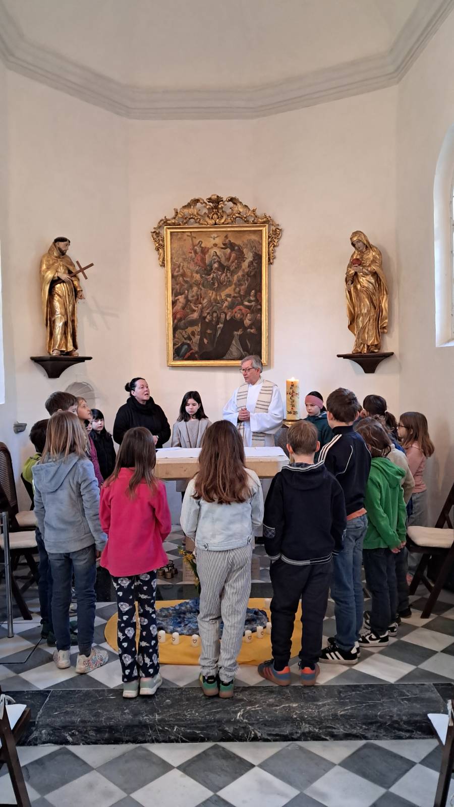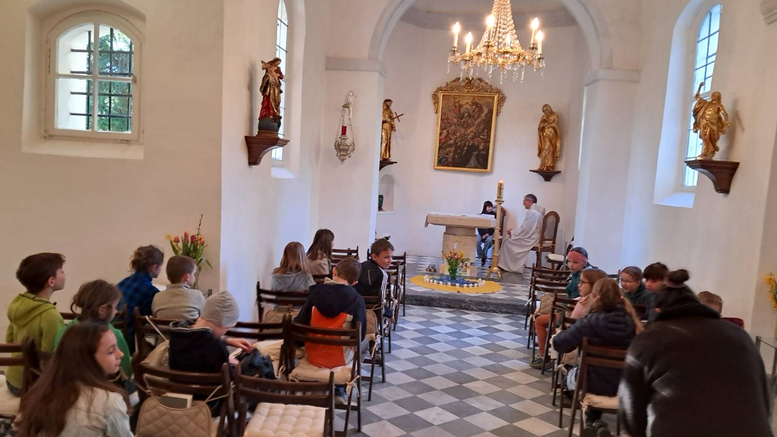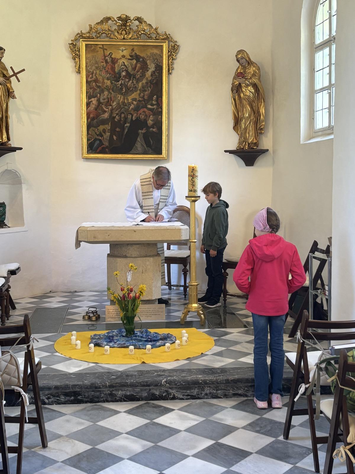 Am 8. April haben katholische Kinder der dritten Klassen in der Allerheiligenkirche mit Pfarrer Schwarz das Fest der Versöhnung gefeiert. Mit der Erzählung vom barmherzigen Vater haben sich die Kinder eingestimmt und für jedes einzelne Kind hat sich Herr Pfarrer Schwarz Zeit für ein Gespräch genommen.