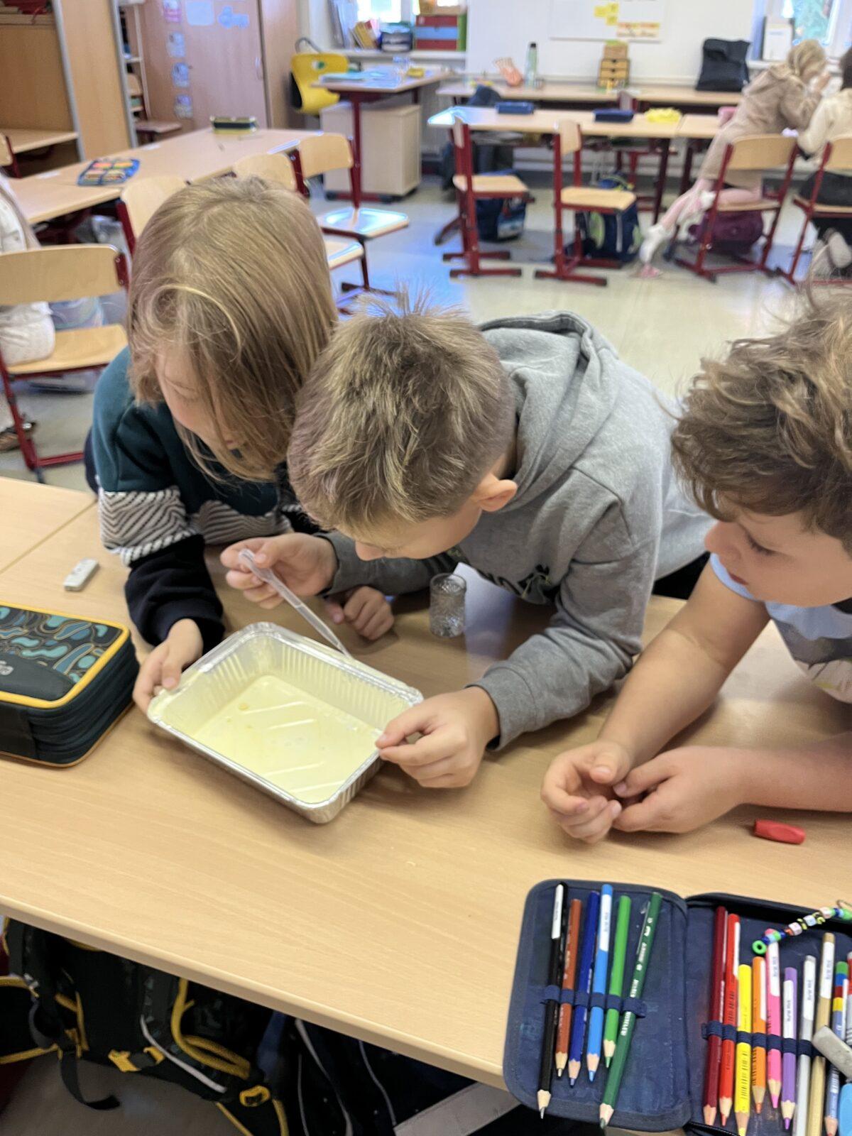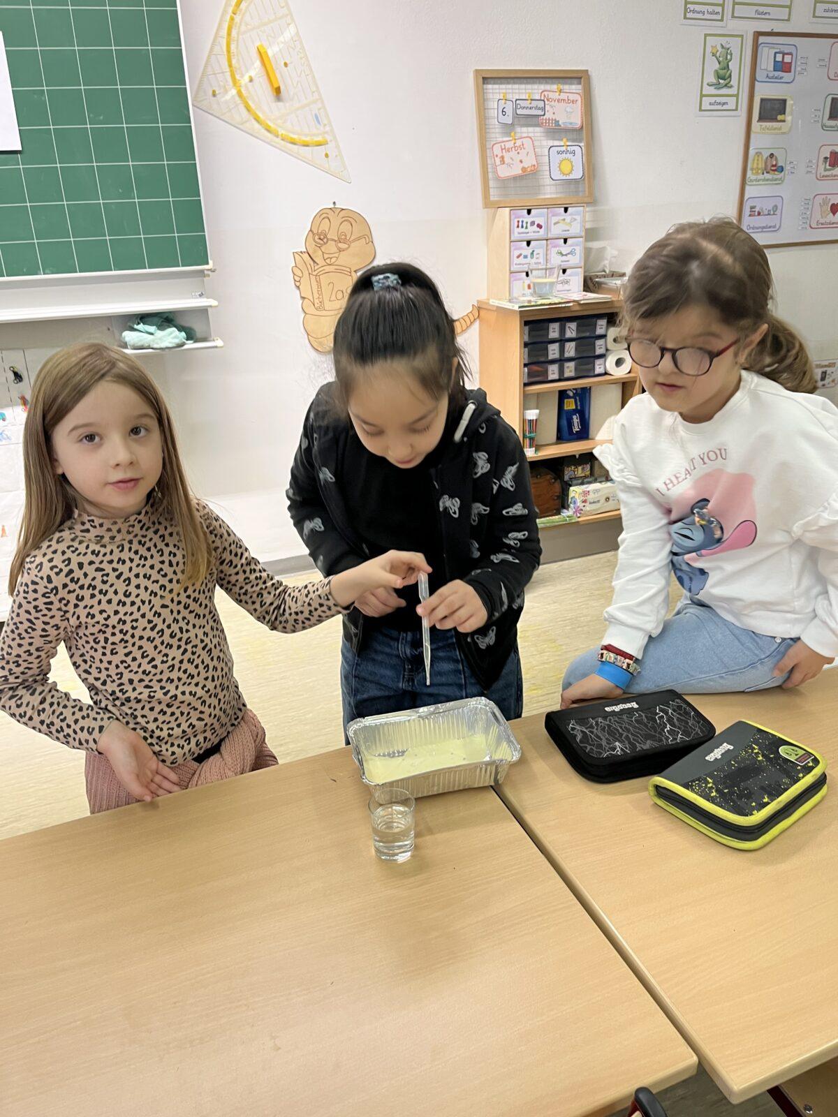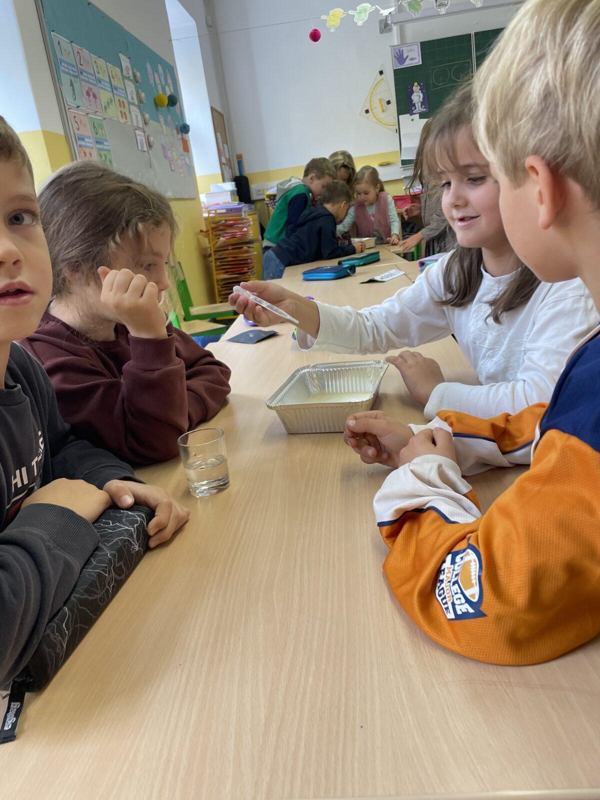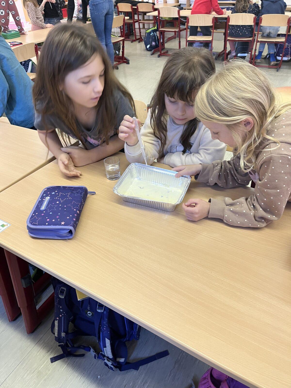 Die Schülerinnen und Schüler der 1B und der 2B Klasse haben als Forscherinnen und Forscher in einem spannenden Experiment herausgefunden, dass Bärlappsporen kein Wasser mögen. Die Sporen schließen das Wasser ein und es bilden sich kleine Perlen, die sogar auf den Sporen „herumkugeln“. Auch die Hand, durch Bärlappsporen ins Wasser getaucht, bleibt trocken. Sensationell!