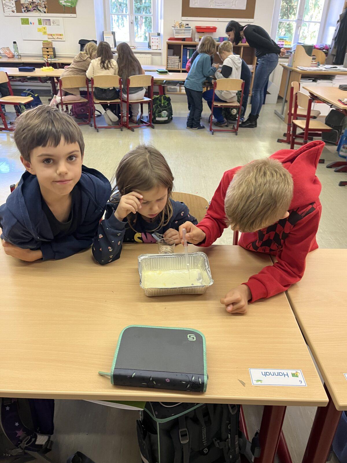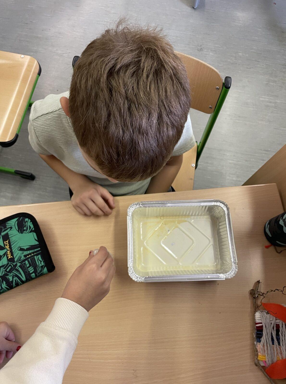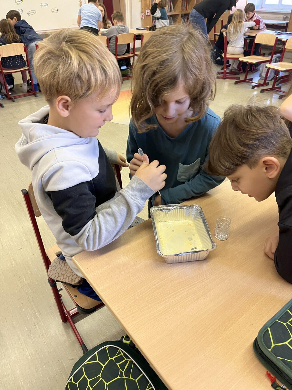 Die Schülerinnen und Schüler der 1B und der 2B Klasse haben als Forscherinnen und Forscher in einem spannenden Experiment herausgefunden, dass Bärlappsporen kein Wasser mögen. Die Sporen schließen das Wasser ein und es bilden sich kleine Perlen, die sogar auf den Sporen „herumkugeln“. Auch die Hand, durch Bärlappsporen ins Wasser getaucht, bleibt trocken. Sensationell!