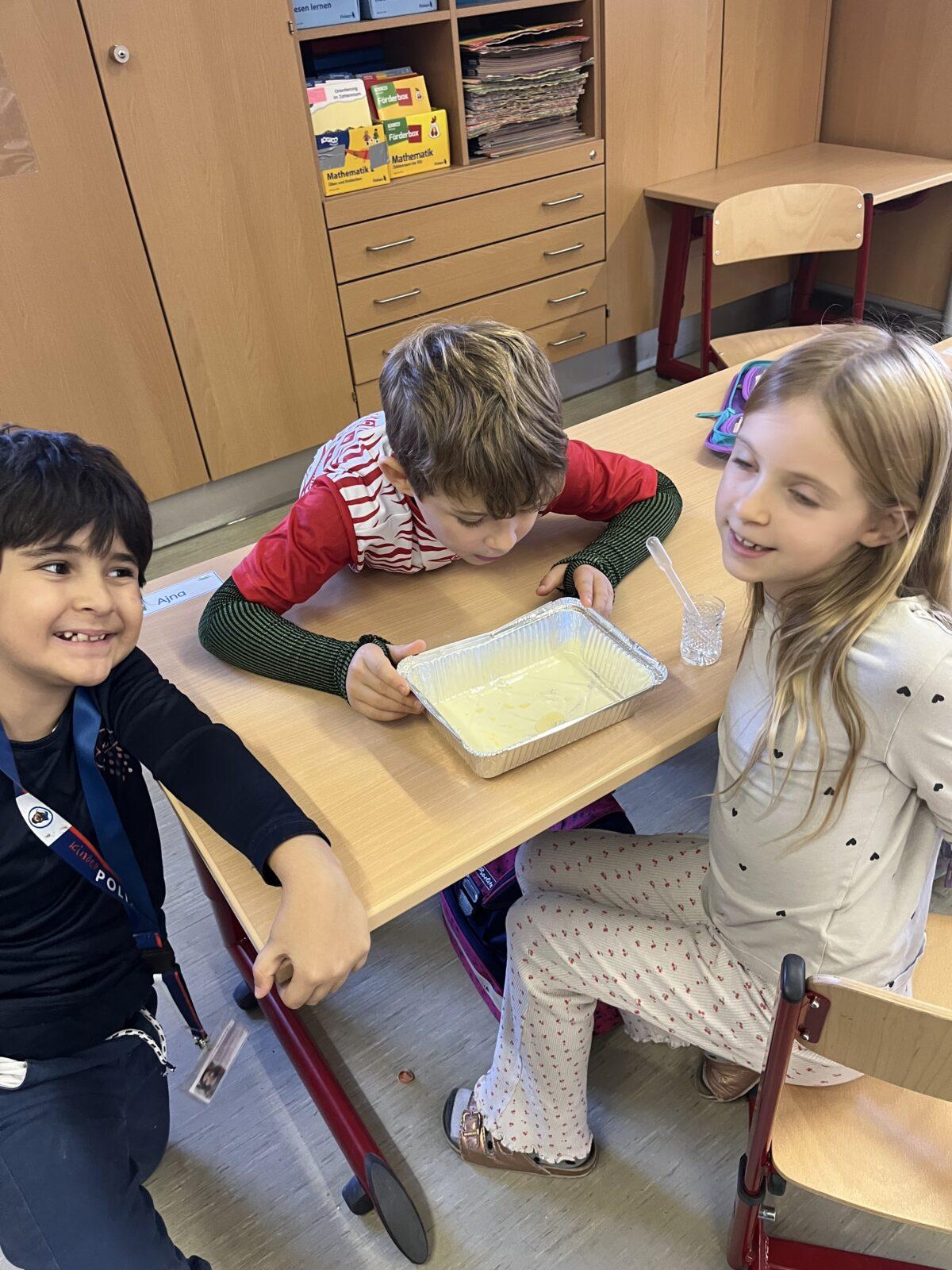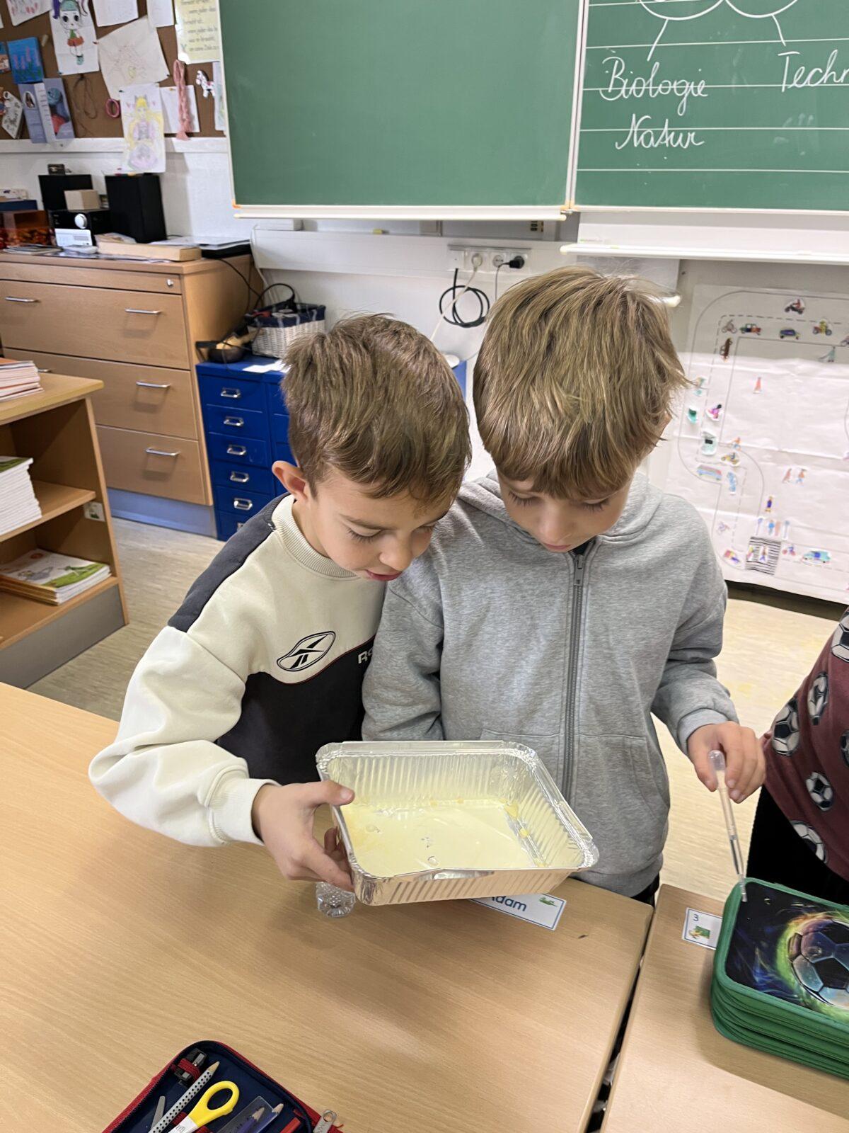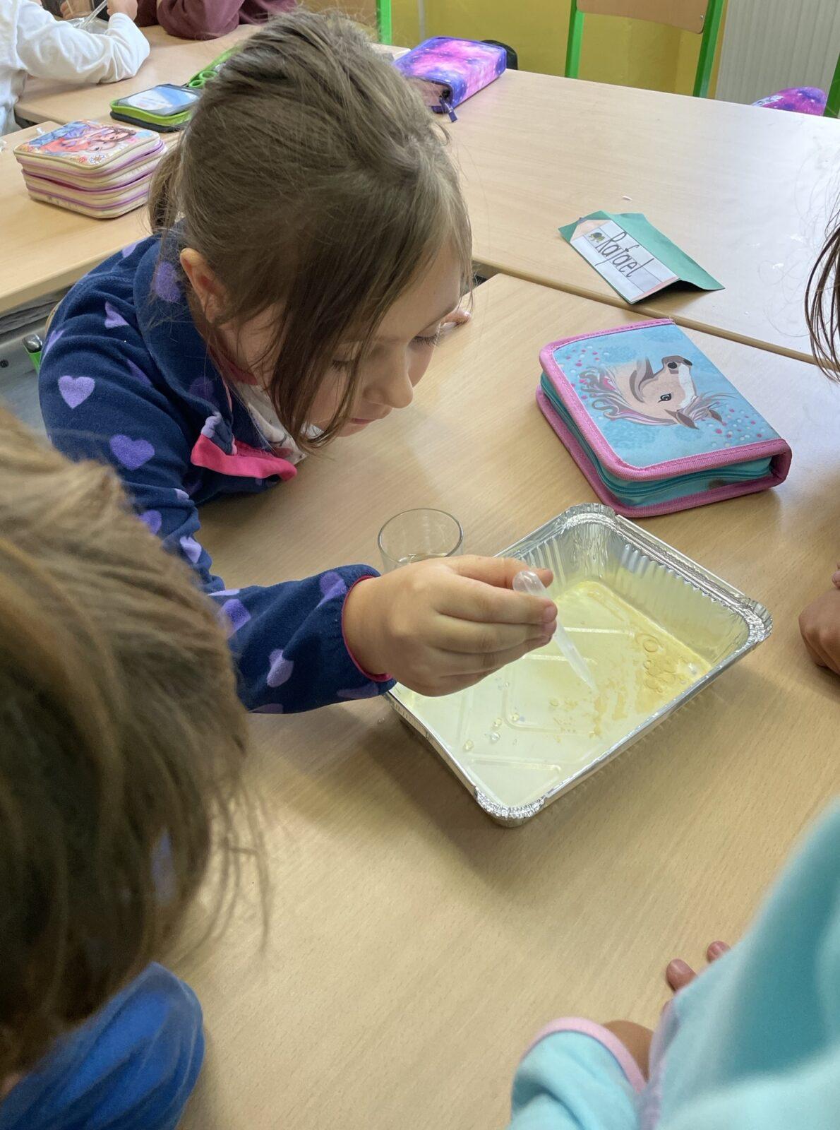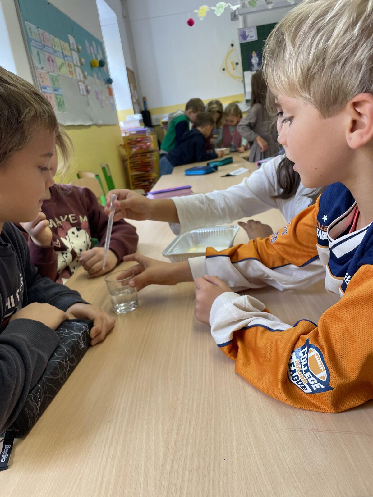 Die Schülerinnen und Schüler der 1B und der 2B Klasse haben als Forscherinnen und Forscher in einem spannenden Experiment herausgefunden, dass Bärlappsporen kein Wasser mögen. Die Sporen schließen das Wasser ein und es bilden sich kleine Perlen, die sogar auf den Sporen „herumkugeln“. Auch die Hand, durch Bärlappsporen ins Wasser getaucht, bleibt trocken. Sensationell!
