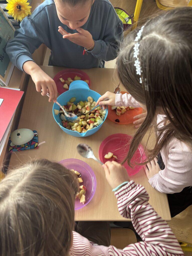 Im Rahmen des Deutschthemas „Rezepte“ hat die Klasse 3B passend zur Jahreszeit einen herbstlichen Obstsalat zubereitet. Die Schülerinnen und Schüler arbeiteten dabei nach einem vorgegebenen