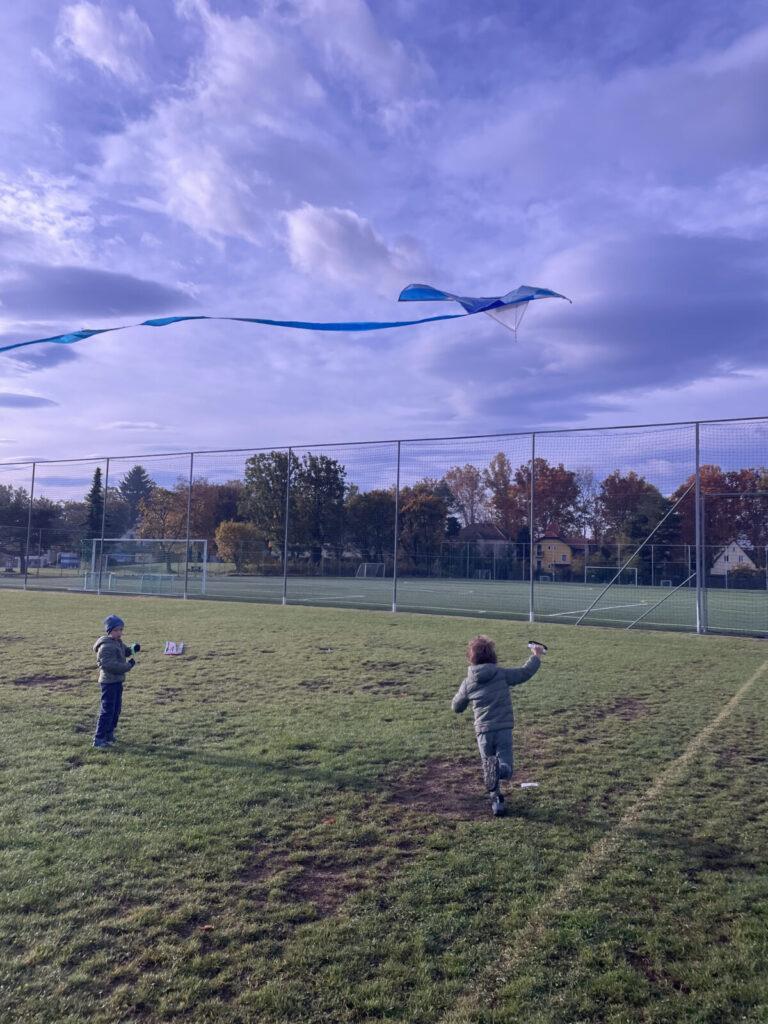 Bei ihrem ersten Ausflug ins ASKÖ Stadion ließen die Kinder der 1B Klasse verschiedenste Drachen steigen. Aufgrund eher windstiller Verhältnisse musste der Wind durch schnelles