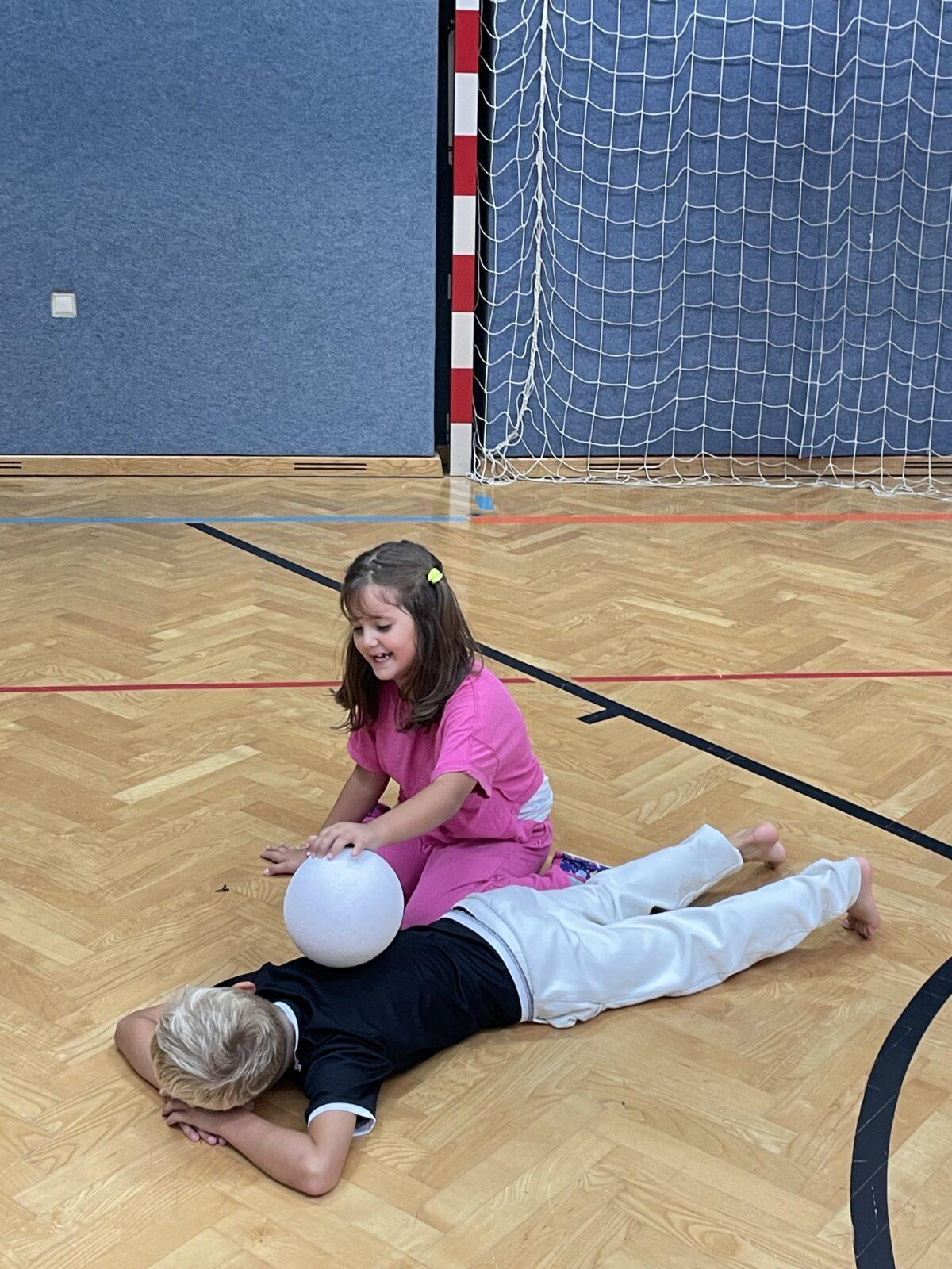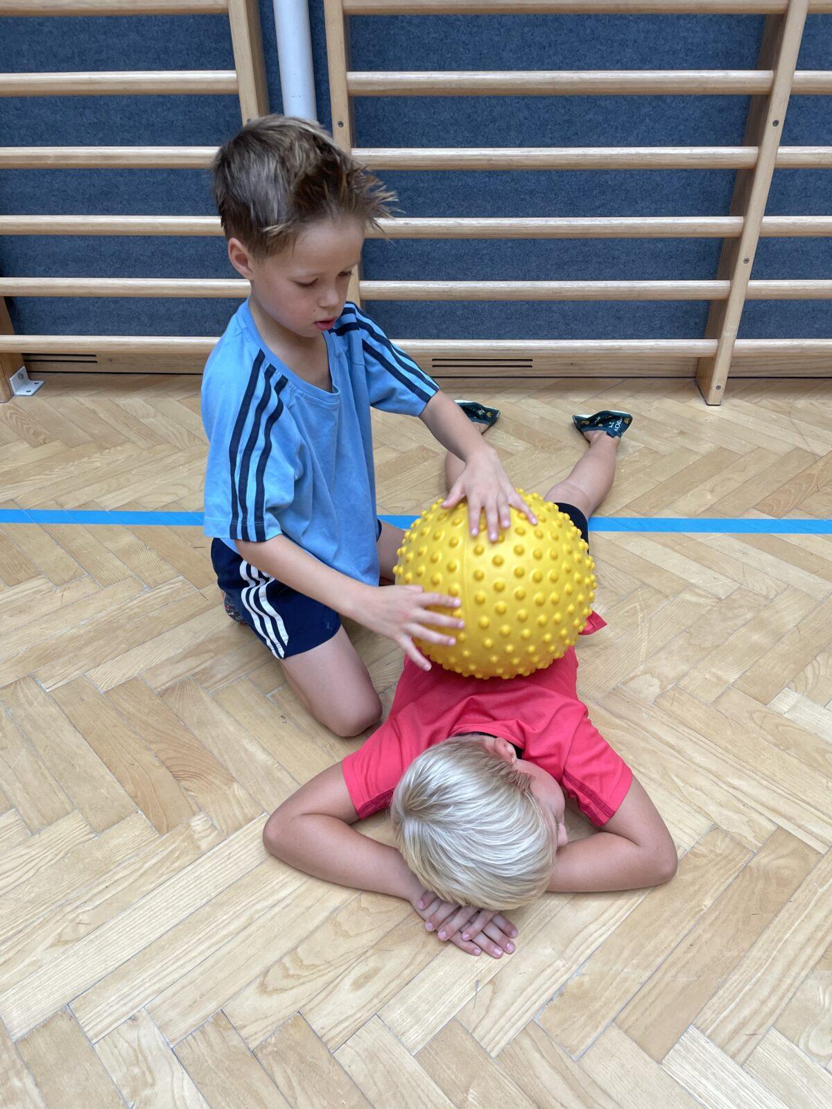 Im Rahmen des Sportunterrichts lernen die Kinder nicht nur Grundformen der Bewegung, sondern auch bessere Körperwahrnehmung. Durch diverse Übungen alleine und im Team konnten die Kinder der 1B Klasse sich und ihren Körper spüren.
